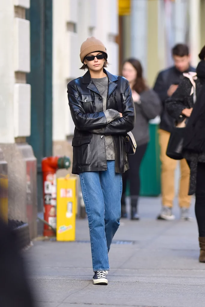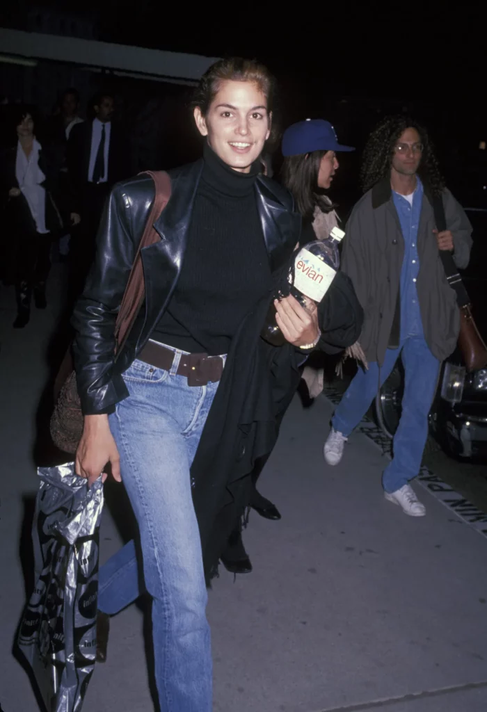 Dans les années 1990 déjà, les It girls et mannequins de l’époque ne juraient que par cet ensemble. En témoigne cette image culte immortalisée par les paparazzis : celle de Cindy Crawford qui, habillée d’un jean cigarette et d’une veste de blazer en cuir, rejoint sa porte d’embarquement dans l’aéroport de Los Angeles. Vingt ans plus tard, c’est sa fille, Kaia Gerber, qui succombe à son tour à ce combo indémodable.